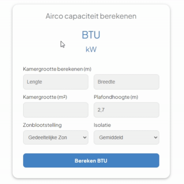 Aanpassingen voor Speciale Condities: Als de kamer speciale omstandigheden heeft (bijvoorbeeld slechte isolatie, hoge bezetting, of significante warmte-genererende apparatuur), kan de calculator een hogere BTU-rating suggereren om deze factoren te compenseren.
