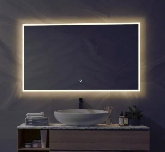 - De spiegel is voorzien van warm witte LED sfeer verlichting rondom. Deze verlichting kan eenvoudig worden in- en uitgeschakeld met een soft touch schakelaar op de spiegel.