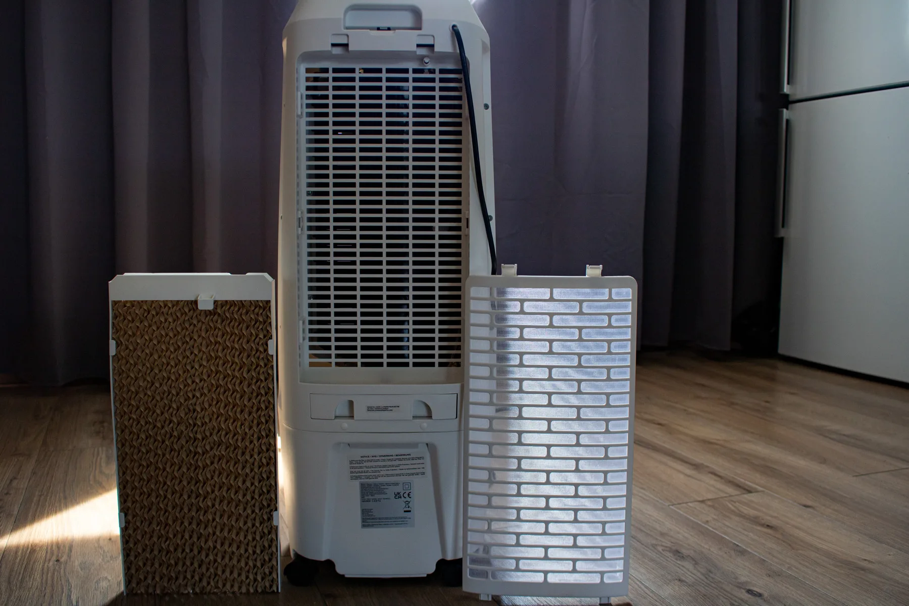 - Koele lucht: Terwijl het langs het koelelement blaast en bevochtigd wordt, daalt de temperatuur waardoor er een verkoelende lucht de ruimte in blaast.