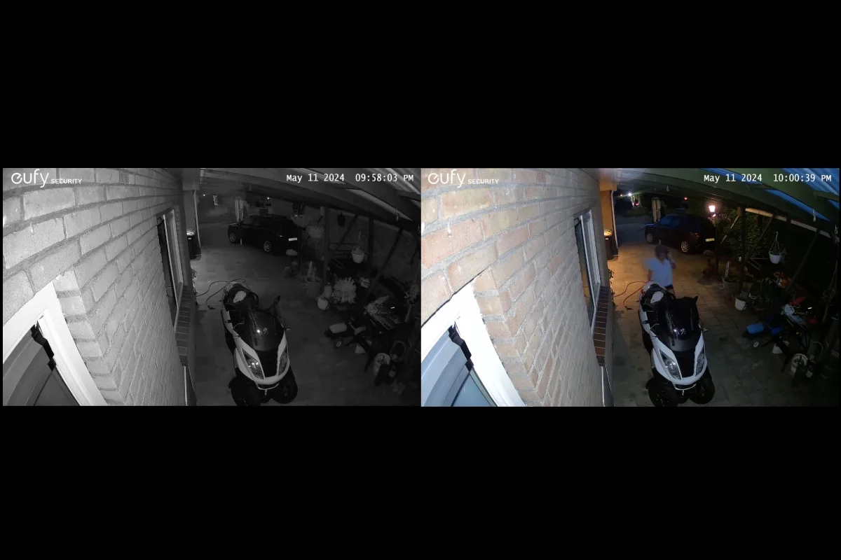 Links is standaard infrarood nachtzicht te zien. Je ziet hier alles nog erg scherp. Wat een mooier beeld geeft is het nachtzicht in kleur (rechts). Wanneer ingesteld, schakelt de Eufycam E330 automatisch over naar kleur als er personen langs lopen.