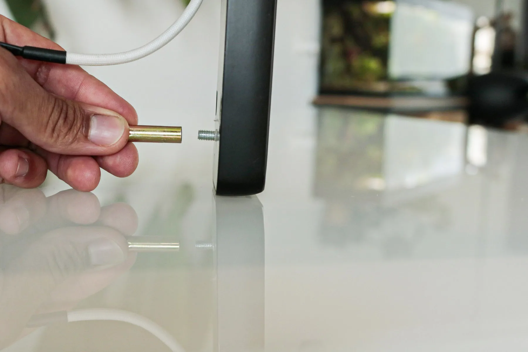 - Verbind de kabels: Leid de kabel van het voorpaneel door de deur en sluit deze aan op het achterpaneel.