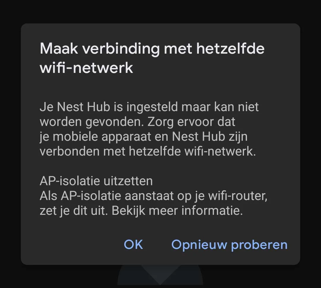 Je Nest Hub is ingesteld maar kan niet worden gevonden. Zorg ervoor dat je mobiele apparaat en Nest Hub zijn verbonden met hetzelfde wifi-netwerk.
