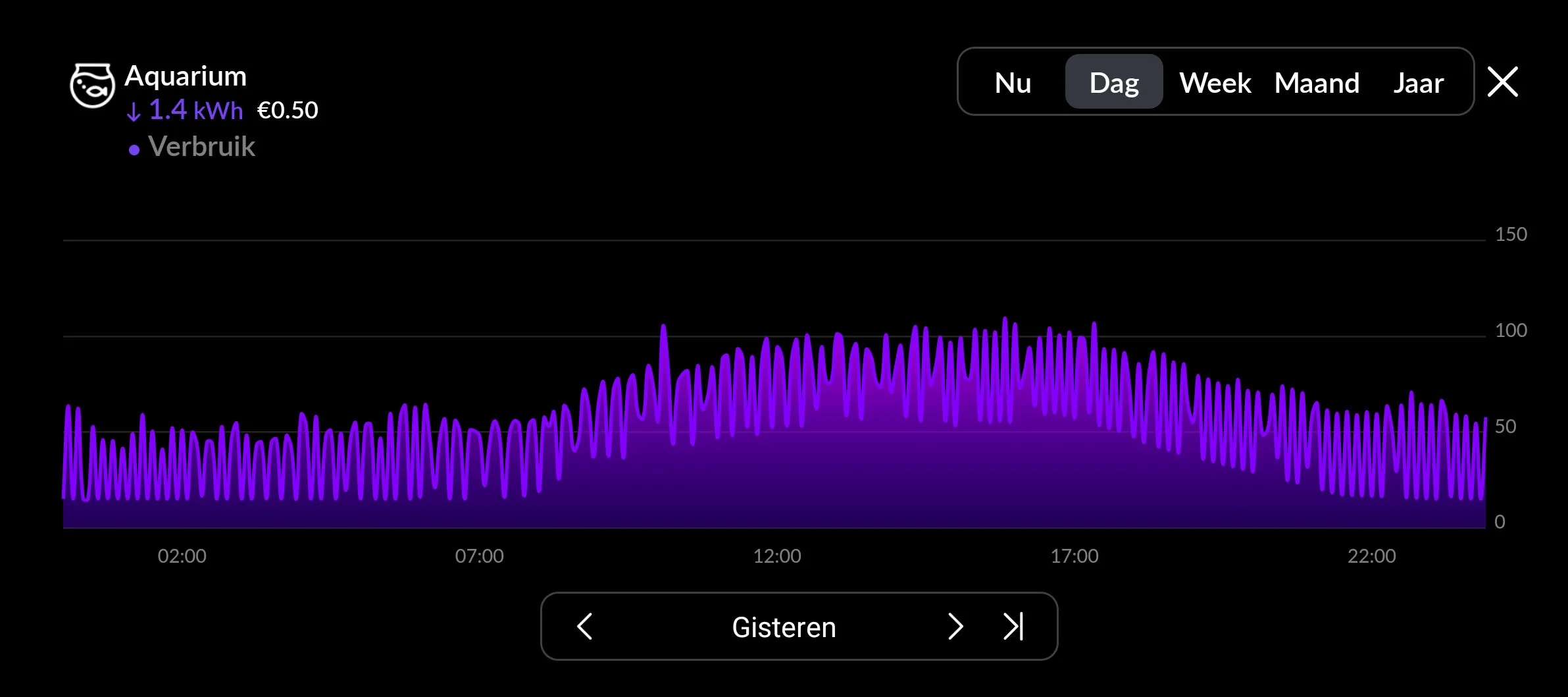 Wij hebben de slimme stekker gebruikt om het verbruik van het aquarium in te zien, een Juwel Rio 240 met twee externe filters, een 200Watt verwarmingselement en CO2 setje en de Juwel HeliaLux lamp. Het is interessant om te zien wanneer het verwarmingselement aanslaat. Ook is het duidelijk op het moment dat de lamp aangaat, en gedurende de dag langzaam aan helderder wordt.