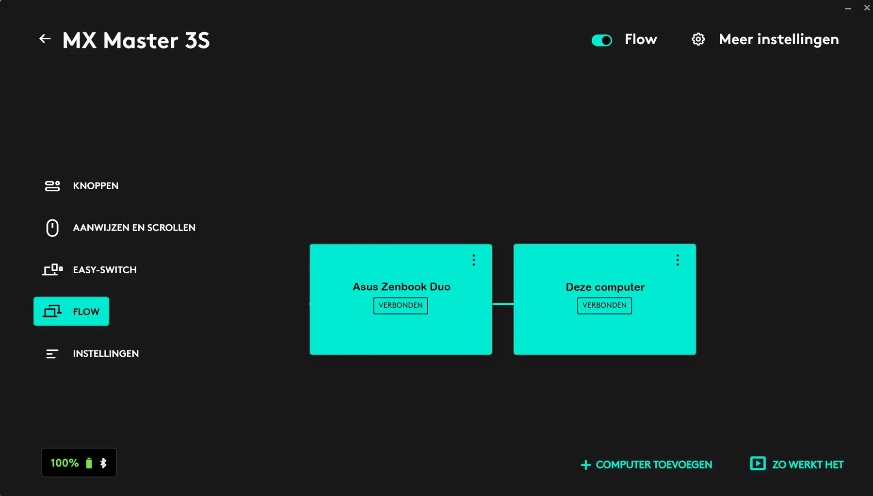 Het begint al bij de manier van koppelen van de muis aan de pc. Dat kan namelijk via de bluetooth dongle, maar ook via bluetooth direct van de pc. Het is mogelijk om met 3 apparaten tegelijk een connectie te maken. Het schakelen tussen de apparaten is in te stellen via ‘Flow’ in de Logi Options+ software.