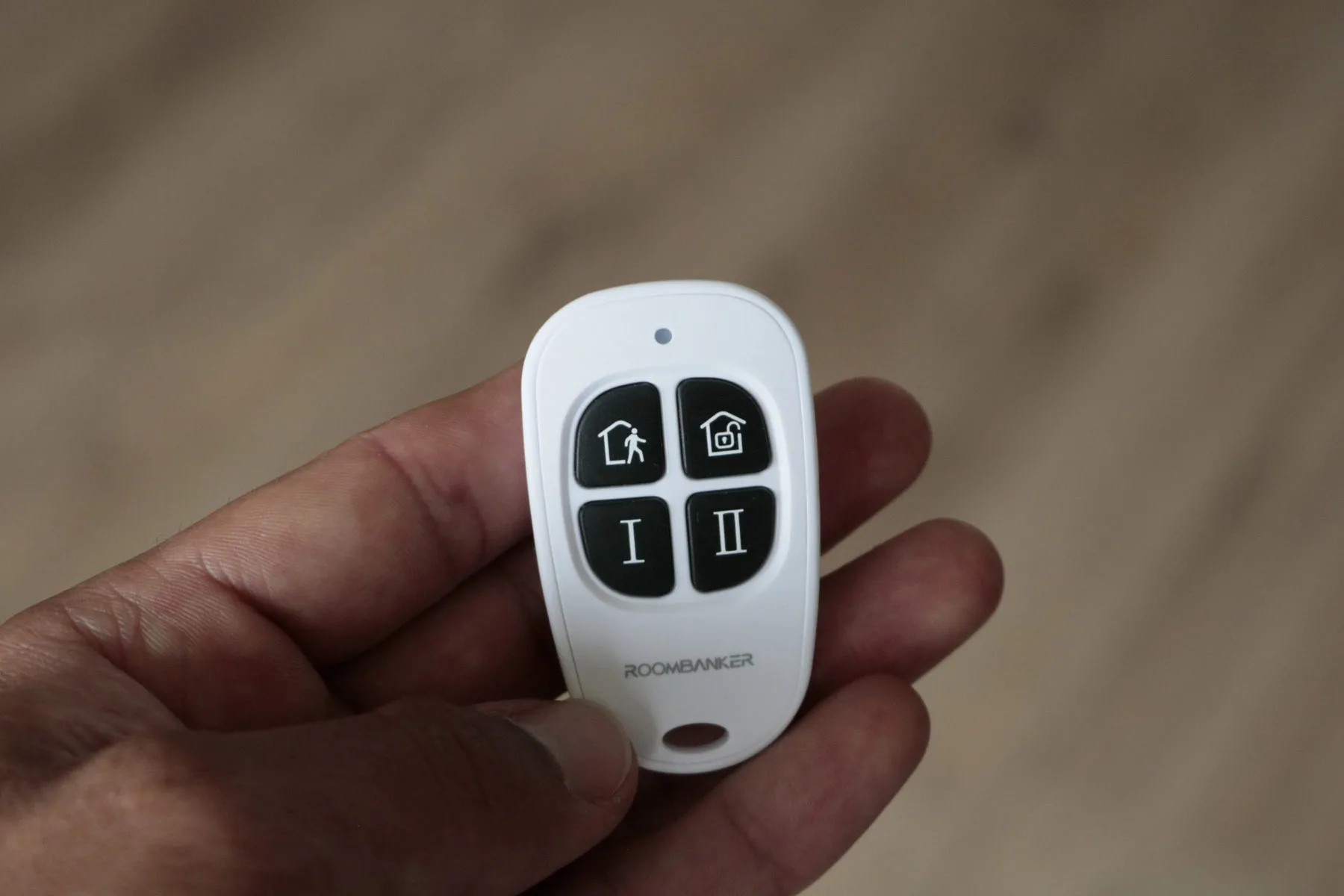 Handig apparaatje met vier knoppen. De bovenste twee knoppen is om het alarm op scherp -en van scherp te stellen. De onderste twee knoppen kunnen worden geconfigureerd naar wens. Zo kan je bijvoorbeeld de slimme stekker hier mee uit schakelen.