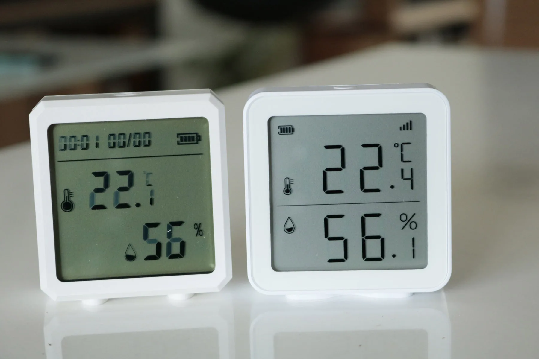 Ook is de kwaliteit beduidend beter dan sommige alternatieven uit China. Neem bijvoorbeeld het verschil tussen de Tuya (links) en Roombanker (rechts) temperatuur en luchtvochtigheids-meter: