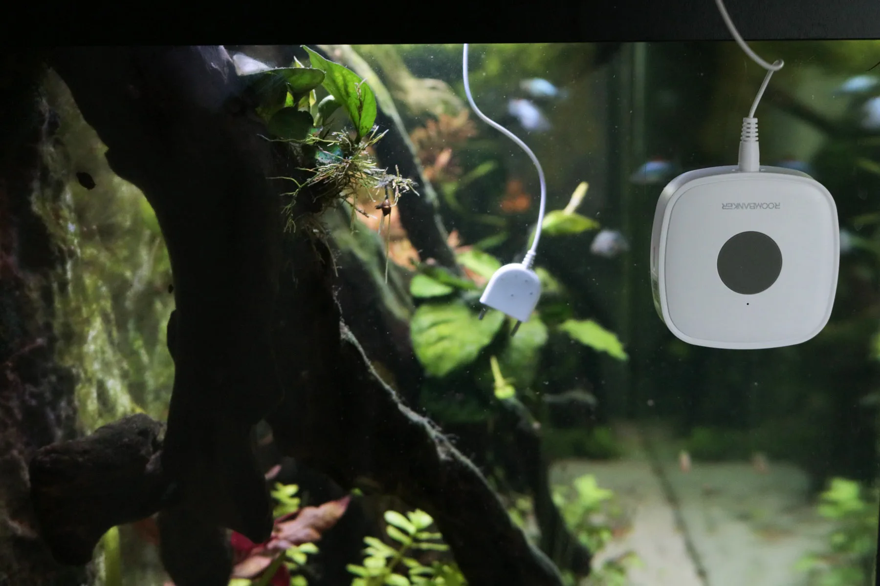 Deze sensor heeft aan de onderkant twee pinnen om te detecteren of er een lekkage is. Zodra hij een lekkage detecteert krijg je een melding op de mobiele app. Naast de pinnen aan de onderzijde is er ook een extensie. De extensie bestaat uit een draad met op het einde twee pinnen. Deze pinnen kan je vervolgens op een locatie plaatsen waar je wilt waarnemen of er water langs stroomt. De sensor bestaat dus uit twee meet-uiteinden.