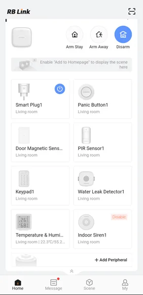 In de bijbehorende app, RB Link, kun je op de homepagina alle aangesloten apparaten zien. Zoals je in het screenshot hier boven ziet is het ook mogelijk om apparaten tijdelijk uit te schakelen, wat wij hebben gedaan met de loeiend harde sirene die telkens afging tijdens het testen van de sensoren. Je kunt helaas geen live beelden van de IP camera bekijken op je smartphone.